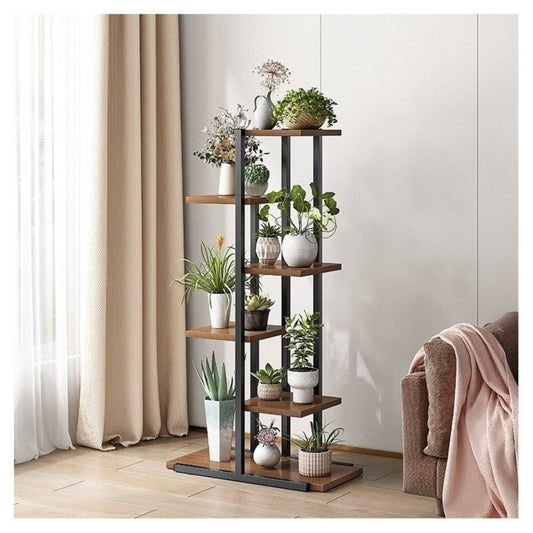 Поставка за цветя, метална, с 6 дървени рафта, 113 x 60 x 20 cm