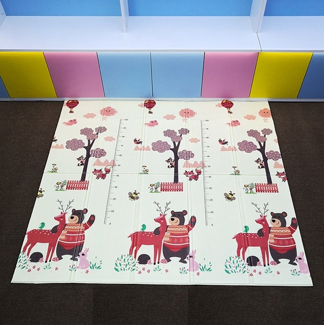 ДВУЛИЦЕВА - ярки цветове и апликации привличат вниманието на детето и стимулират зрението и въображението му; от двете страни има отпечатани приказни картинки, които спомагат за научаването и запомнянето на нови думи. Постелката има мярка за височина, благодарение на която лесно може да измерите вашето дете в легнало положение. Изключително подходящи докато детето се учи на пълзене и ходене. Неплъзгащата се конструкция ще се погрижи за безопасността на малкото дете при първите му стъпки.